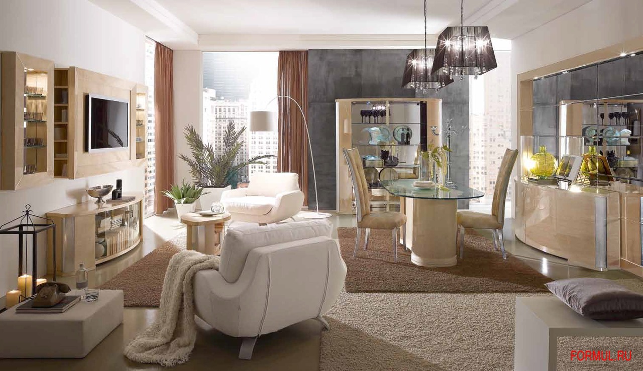 Гостиная, спроектированная в стиле “open space”, предоставляет широчайшие возможности для проведения досуга: уголок отдыха, обеденная и барная зоны словно накладываются друг на друга, расширяя границы возможного.