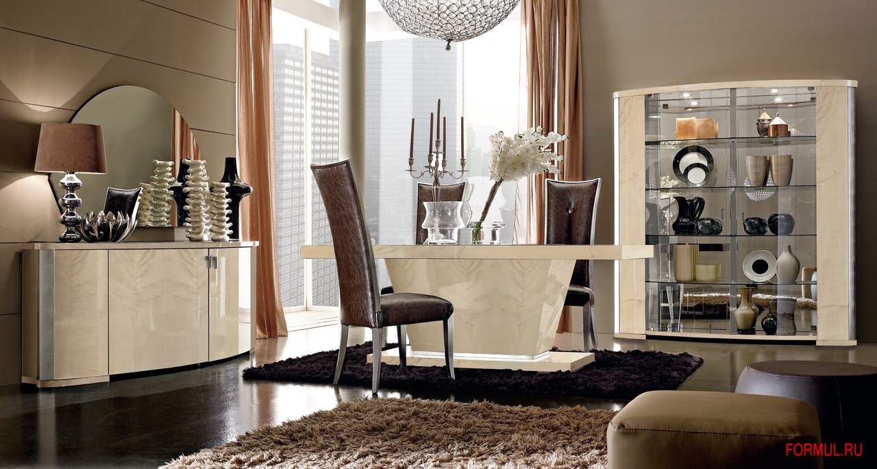 Мягкие линии лицевых панелей буфета и серванта, изогнутая формы обеденного стола и несущих частей мебели, украшенных сусальным серебром, акцентируют внимание на элегантности и гармоничности коллекции.