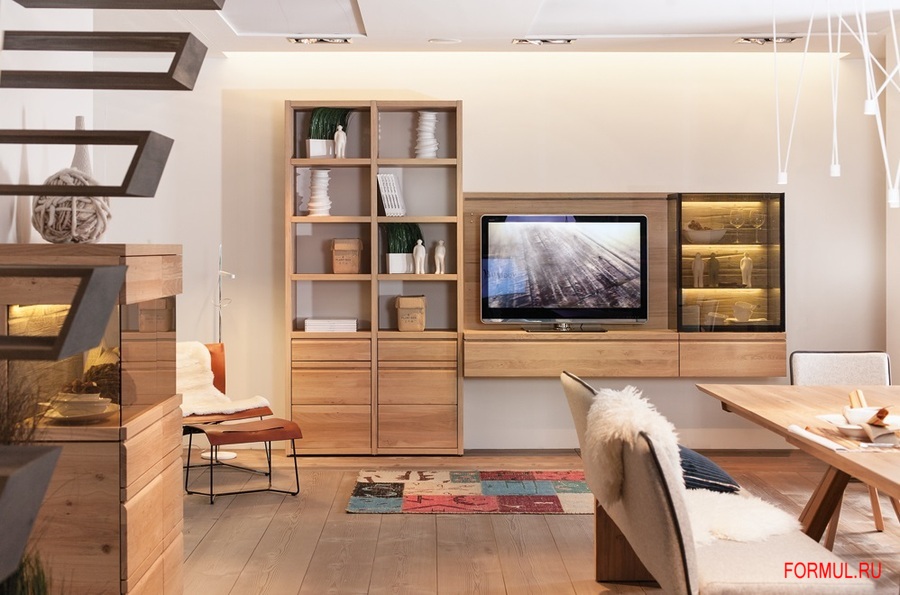 Гостиная V-Loft очаровывает своим великолепием. Великолепие вырожается в естественном происхождении используемых материалов, таких как дуб или грецкий орех. Креативое решение позволило облегчить задние деревянные стенки мебели , что повлияло на вес всех стенки в целом. Многочисленные визуальные эффекты, такие как световые блики присутствуют в изделии благодаря естественной структуре дерева.