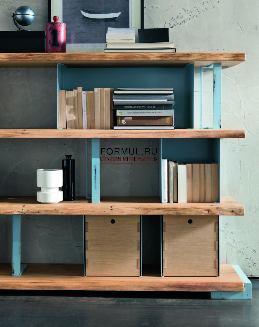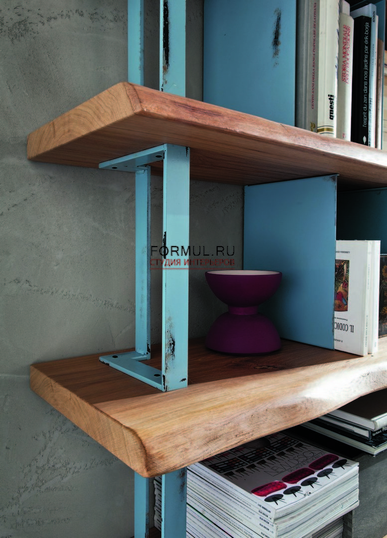 Книжный шкаф Ecolab с полками из массива дуба, открытый .Железная конструкция , окрашенная в голубой цвет .