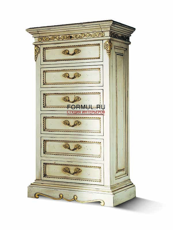 Высокий комод в классическом стиле с шестью выдвижными ящиками.