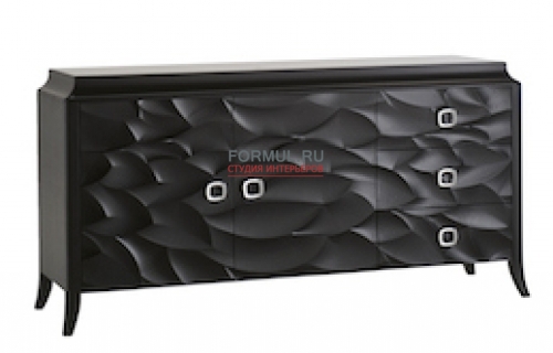 Черный комод с необычным дизайном дверей имеет 3 ящика и 2 дверцы .