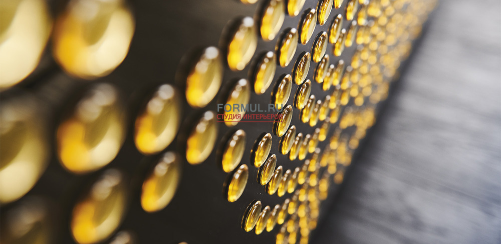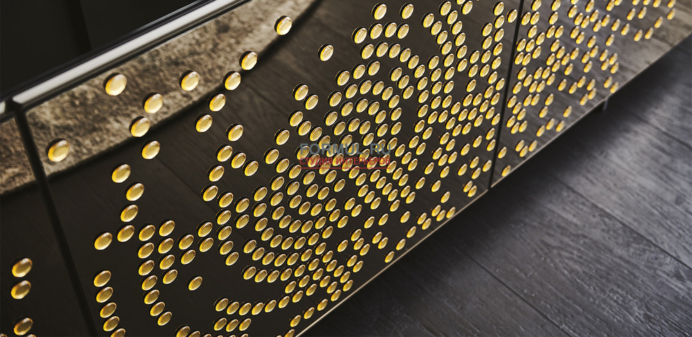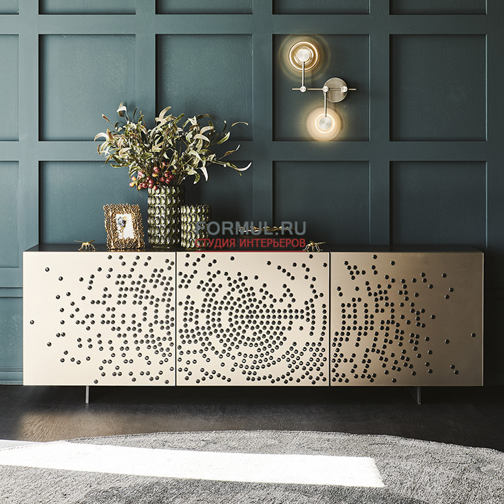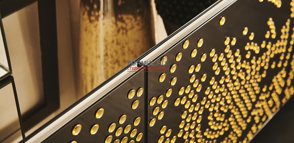 Стильный двух или трёхстворчатый буфет из полированной лакированной древесины. Дверцы выполнены из зеркального матового бронзового стекла с золотым или черным декором.