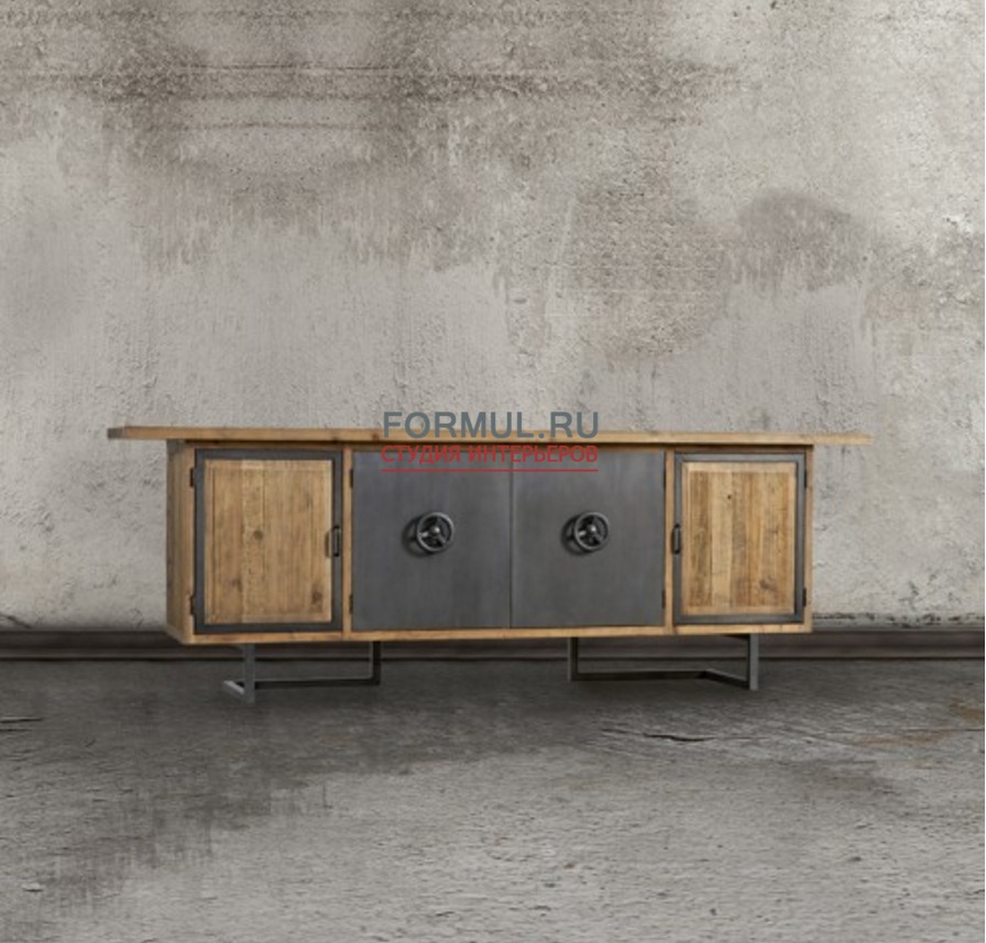 Комод с 4 дверцами выполнен из состаренной сосны, центральные дверцы обшиты металлом, а боковые дверцы с окантовкой из металла. Ручки металлические.