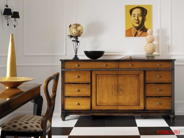 Деревянный комод от итальянского производителя Pregno. Модель с двумя распашными дверцами посередине и с множеством выдвижных ящиков вокруг. Комод на невысоких ножках. Корпус данной модели выполнен из натурального дерева, ручки металлические, модель покрыта лаком. Этот функциональный предмет мебели выполнен в классическом стиле. Цвет от производителя натурального дерева.