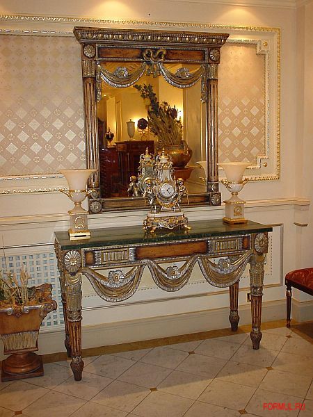 Цветы и драпировки, искусно вырезанные из дерева и покрытые золочением, отлично поддерживают стилистику "Русской Империи".