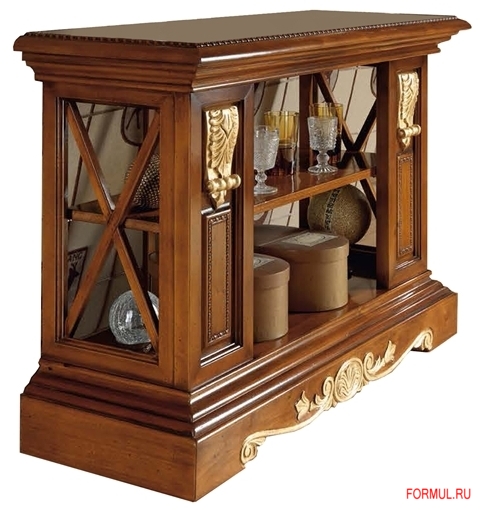 Консоль в классическом стиле. Включает открытую полку в нижней части. Может использоваться для хранения книг и дисков. Выполнена из массива натуральной древесины. Отделка поверхностей – лак, пчелиный воск. Отдельные элементы декорированы позолотой.