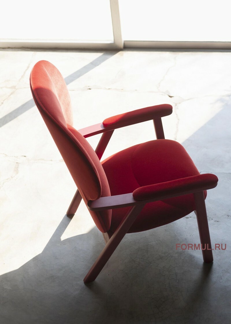 Каркас кресла выполнен из натурального ясеня, который может быть окрашен в различные оттенки или покрыт матовой лаковой отделкой. Скошенные ножки плавно переходят в изящные подлокотники, декорированные мягкой обивкой из кожи или ткани.