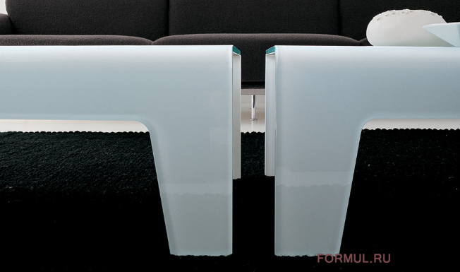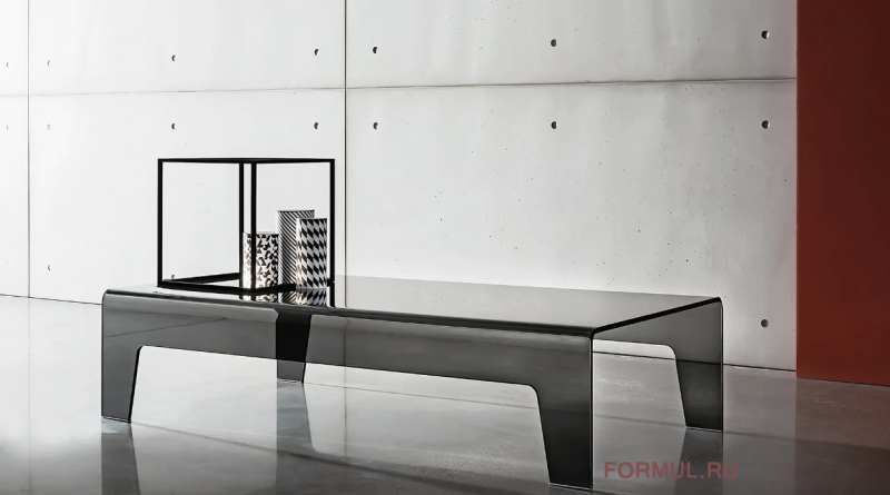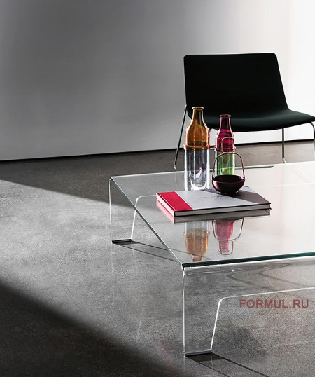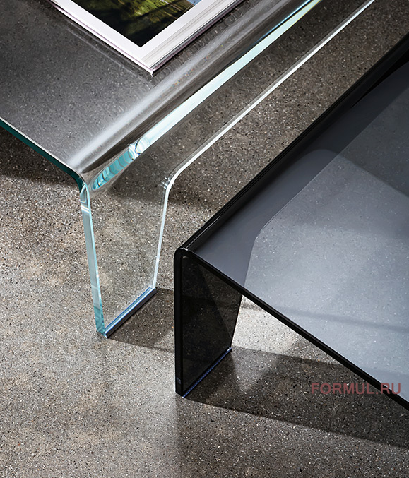 Журнальный столик из сверхлегкого прозрачного или лакированного однотонного или двухцветного гнутого стекла. Дымчатая отделка доступна только в прямоугольной версии.