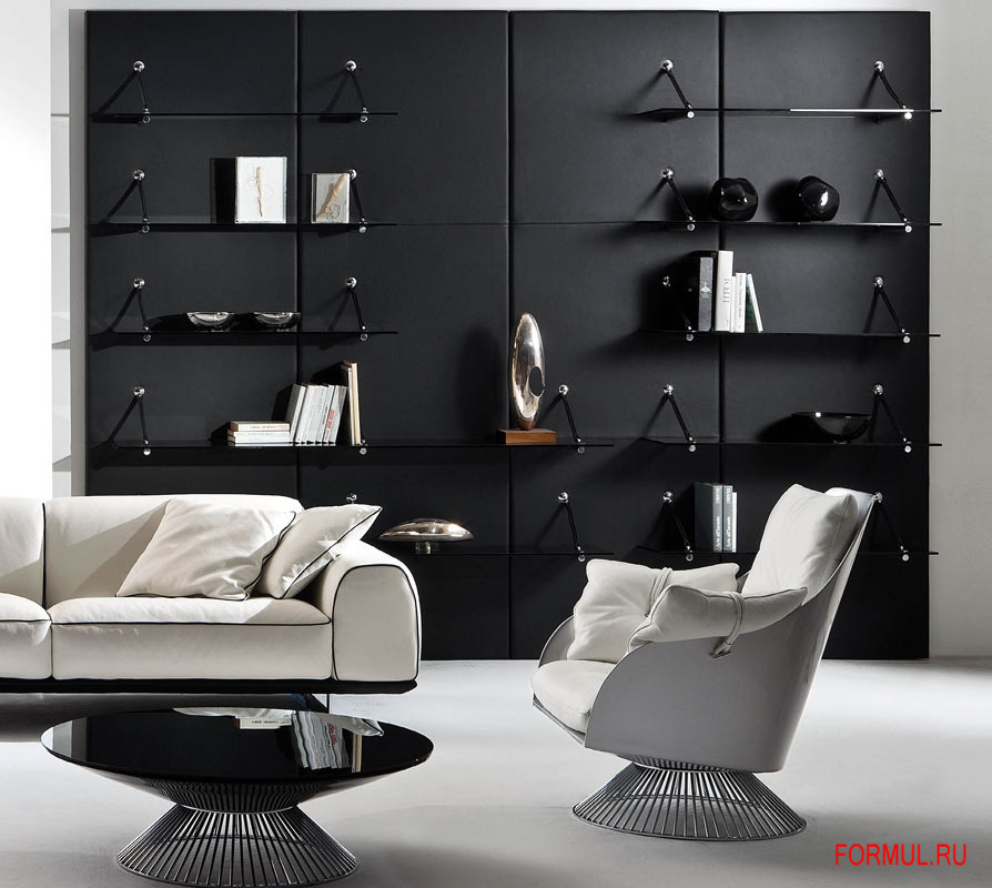 Полки Boulevard от итальянской фабрики Gamma выполнены в современном стиле. Система полок состоит из деревянных панелей, которые покрыты кожей, хромированных металлических опор и полок из дымчатого или прозрачного стекла. Полки 1 см в толщину и 28 см в глубину, есть три варианта по длине: 110, 152.5 и 195 см. Размеры деревянной панели: 85х5х252.