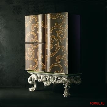 Шкаф с тремя изогнутыми створками, украшенными инкрустацией из шпона различных пород древесины. Внутри расположены полки из многослойного стекла толщиной 10 мм. Отделка – серебряная фольга, лак и полировка. Основание изготовлено из массива древесины и украшено резьбой ручной работы; для отделки использована травленая и патинированная серебряная фольга.
