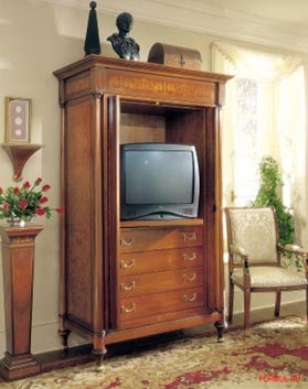Шкаф для ТВ в стиле ампир, с узором в виде короны. Двери и боковые панели украшены шпоном. Две боковые дверцы, 4 ящика.