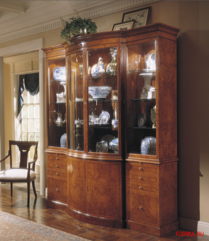 Витрина в викторианском стиле из трех частей. Полукруглый центр. С 3 стеклянными полками за каждой из 4 дверей. По одной деревянной полке за 2 дверцами. Два выдвижных сервировочных столика, с 6 ящиками, 2-мя глубокими ящиками.