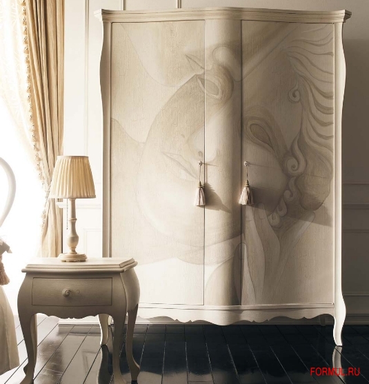 Коллекция вместительных удобных шкафов с двумя, тремя или четырьмя дверцами. Модель имеет фигурную форму и отделана резными элементами.