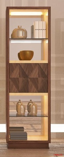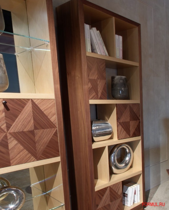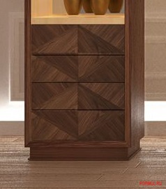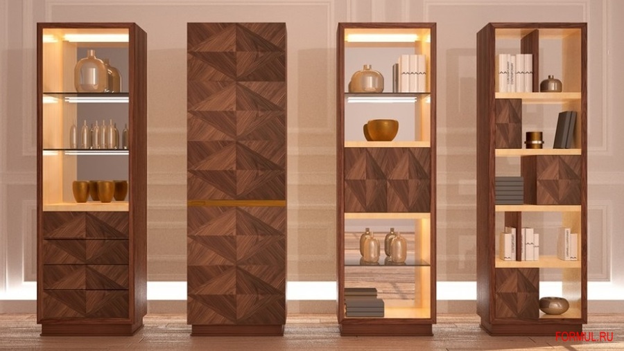 Стеллажи, декорированные фирменной интарсией на фасадах. каждый стеллаж снабжен различными вариациями сочетаний полок и ящичков для более удобного размещения всех необходимых вещей. Задняя стенка является зеркалом и сверху идет подсветка.