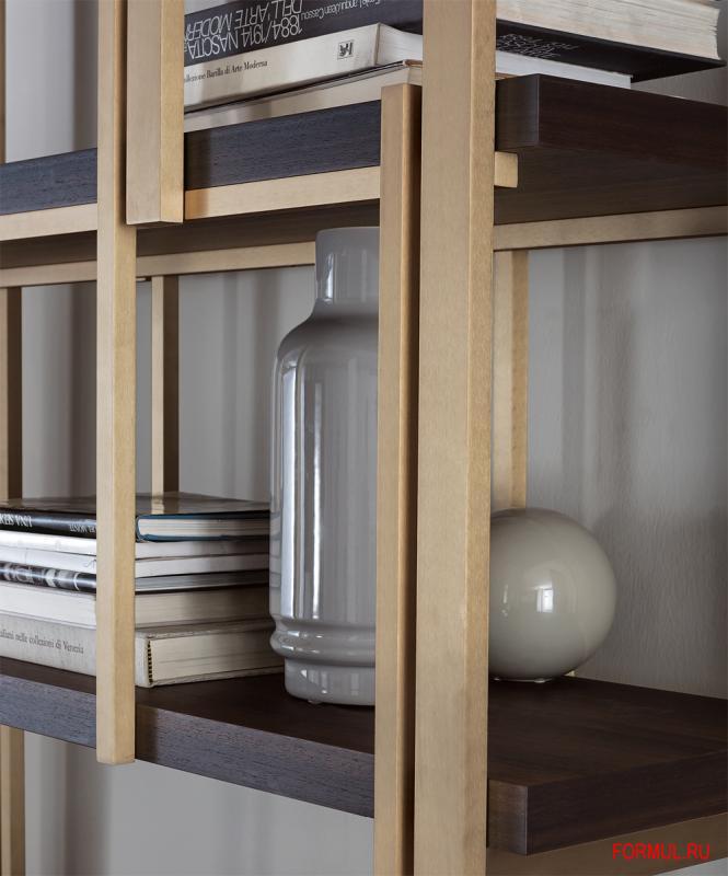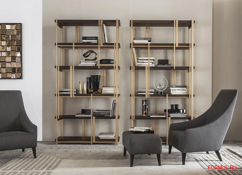 Открытый стеллаж от Массимилиано Раджи выглядит очень современно, свежо. Состоит из пяти полок, его можно ставить с любой стороны, так как у конструкции нет задней стенки, а структурные элементы сделаны из металла с эффектом брашированной латуни.