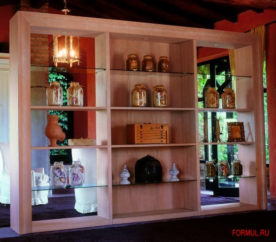 Состоит из двух средних двусторонних отделений по 86 см и одного с задней стенкой на 112 см, с деревянными и стеклянными полками