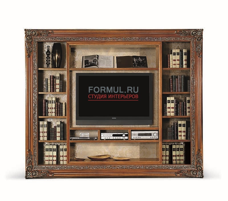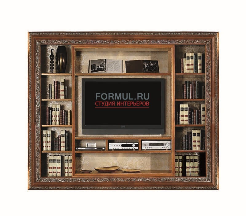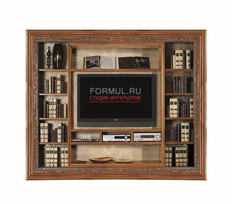 Стенка-книжный шкаф с местом для TV, нишами для техники и полками для книг.