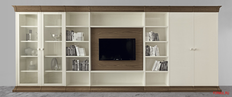 Модульная библиотека. Модули шириной 60 см могут быть выполнены в версиях с открытыми полками, деревянными дверцами, стеклянными дверцами в деревянной раме с декоративной решеткой или без таковой. Модули шириной 140 см выполнены в версиях с открытыми полками и под ТВ.