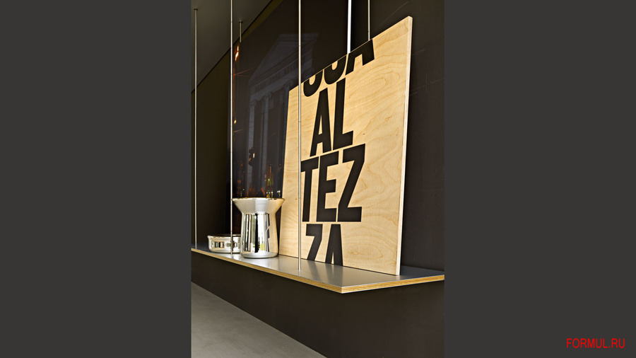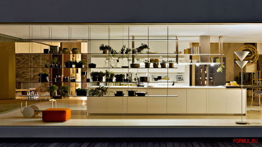 Регулируемые полки поддерживаются тонкими скобами (крепятся к скрытому несущему механизму).