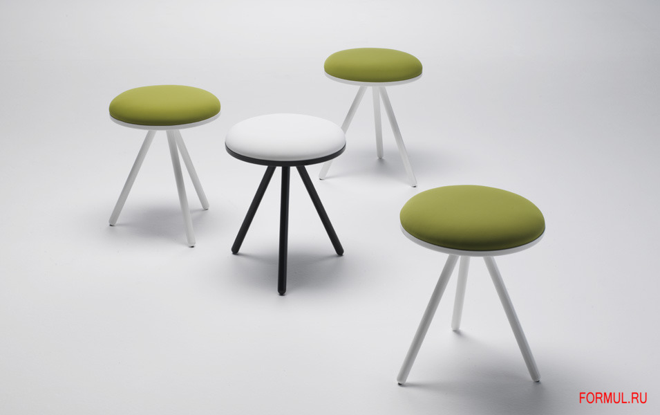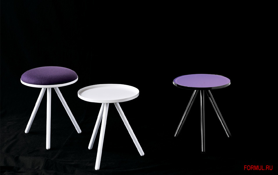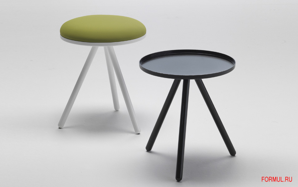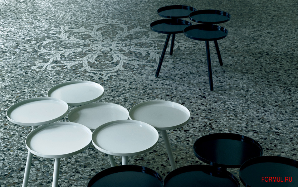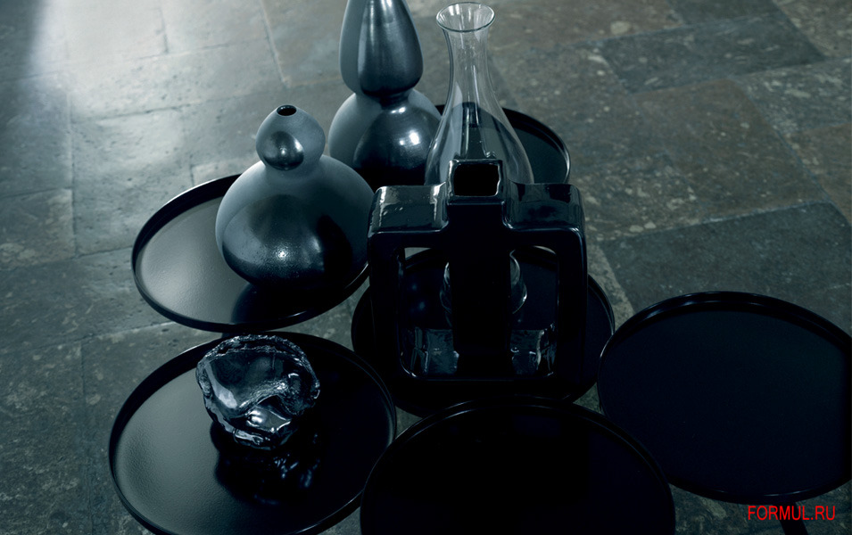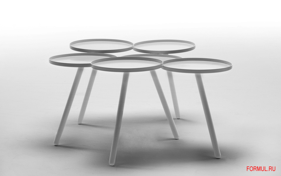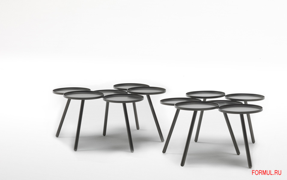 Журнальный столик необычного дизайна. Топ состоит из шести круглых металлических "подносов", приваренных друг к другу. Шесть ножек (металлические трубки) различаются по высоте, отчего каждый "поднос" располагается чуть выше или чуть ниже соседнего. Модель окрашена порошковым способом в цвета из каталога фабрики.
