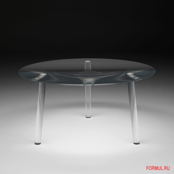 Круглый журнальный столик на трех ножках цилиндрической формы. Полностью изготовлен из прозрачного оргстекла с глянцевой поверхностью. Столешница выполнена в форме линзы. В коллекцию также входит обеденный стол аналогичного дизайна.