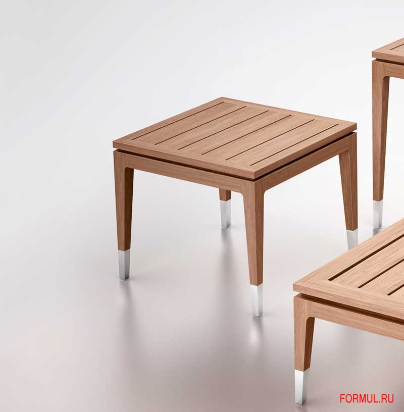Низкий столик, полностью изготовленный из древесины тика. Наконечники ножек выполнены из полированного алюминия. Модель может использоваться в домашнем интерьере и на открытом воздухе.