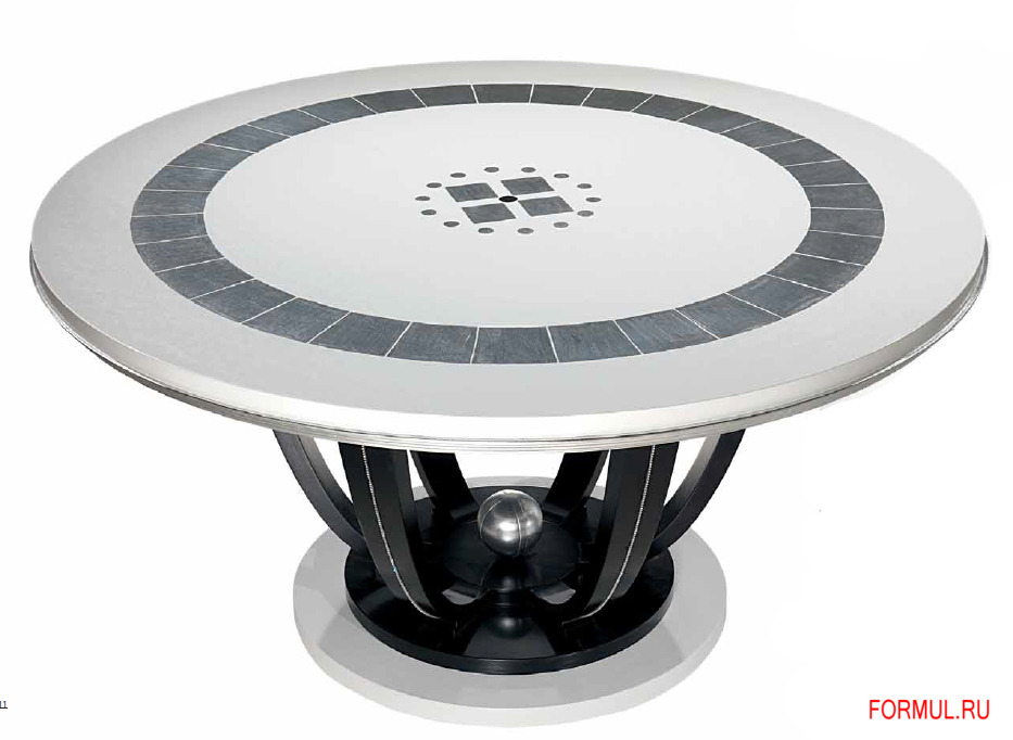 Столешница и основание покрыты лаком контрастных оттенков ("белый перламутр" и "глянцевый черный"). Подстолье, "мозаика" на топе и декоративный элемент в центре основания отделаны сусальным серебром.