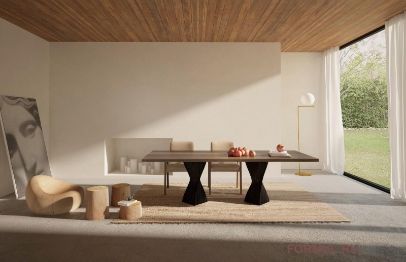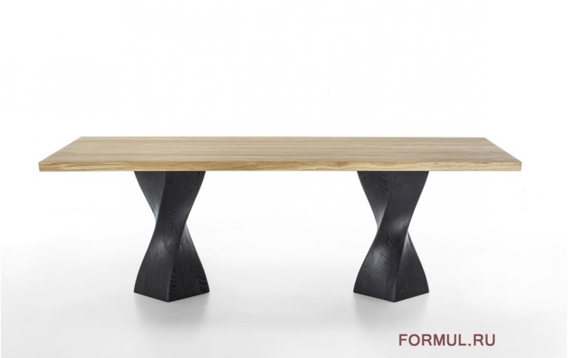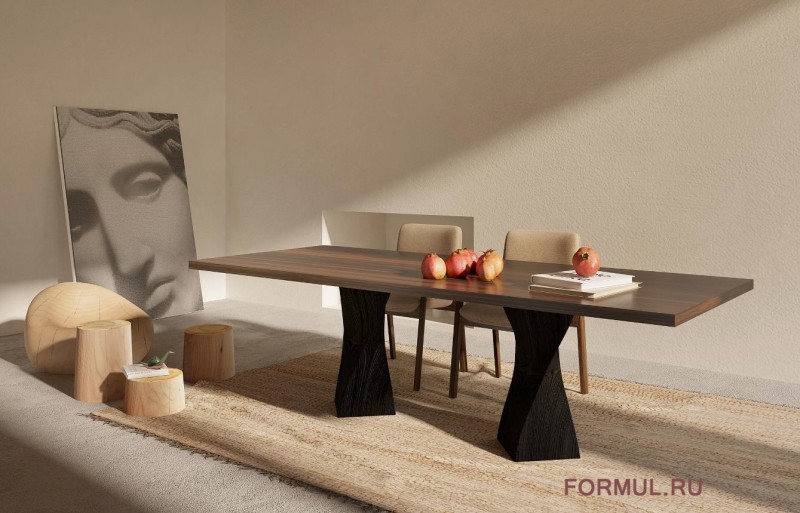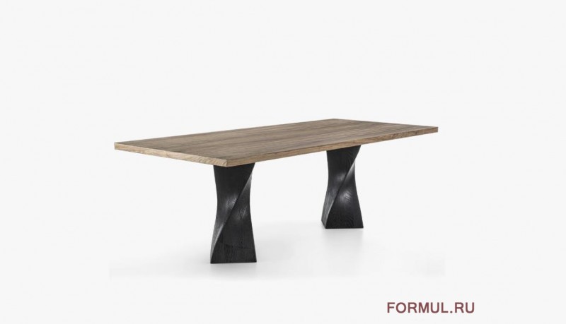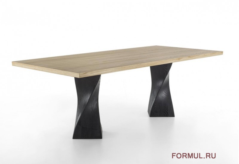 Стол со столешницей из массивной шпонированной плиты и скошенными краями. Его отличают две ножки из массива дерева с пигментированным покрытием. Обработка придает ему движение и динамичность.