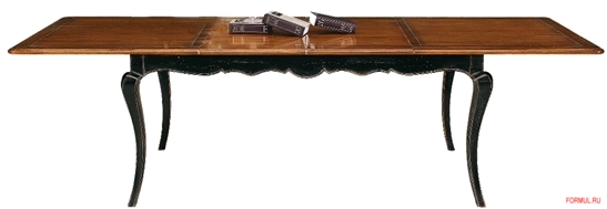 Обеденный стол-трансформер (длину столешницы можно увеличить за счет двух вкладок-расширений). Выполнен из древесины вишни. Отделка поверхностей – лак, пчелиный воск. Классический дизайн подчеркивают изящные изогнутые ножки и фигурная царга - их контуры акцентированы серебром.