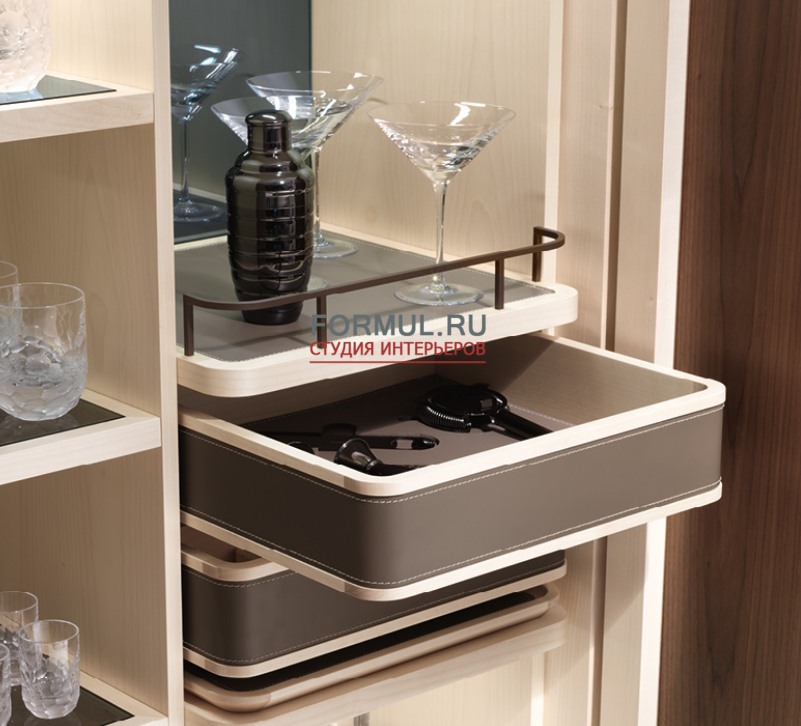 Центральные двери низкой версии имеют полки в седельной кожи и двумя ящиками с передними сторонами в седельной кожи, которые полностью съемная с утопленными скользящими направляющими и бесшумным закрытием системы. Внутренние полки боковых дверей в бронзовой закаленном хрустале.