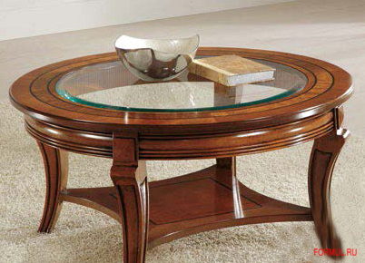 Фигурный круглый столик со стеклянной столешницей, выполнен полностью из дерева, в традиционном классическом стиле.