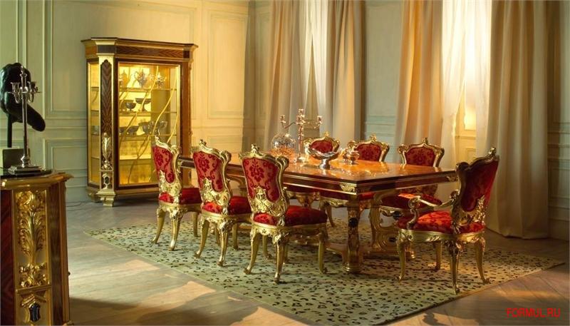 Гарнитур для столовой от итальянского производителя Colombo Stile. Состоит из обеденного стола и стульев. Каркасы модели выполнены из массива древесины. Отделка предлагается глянцевым лаком и шпоном. Стулья с подлокотниками и без. Обивка текстильная из каталога компании. Выполнен гарнитур в классическом стиле.