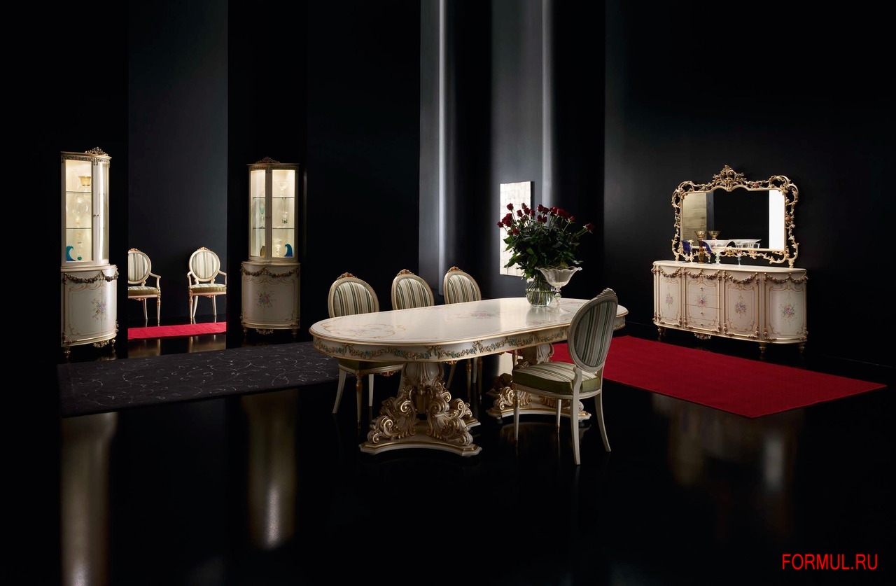 Материалы/отделка: элитные ткани/кожа, натуральное дерево, стекло, резные элементы, сусальное золото/серебро, инкрустации.