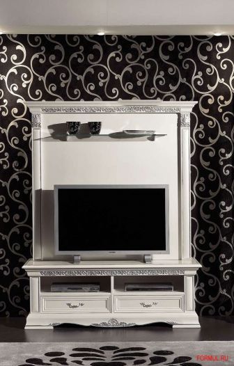 В наличии на складе в Москве гостиная Vivaldi Bianco представлена в 2 вариантах отделки: белый (молочный) лак с золотой фольгой , а также цвет белый перламутр с серебряной фольгой , которой покрыты резные декоративные детали мебели.