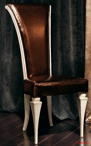 Стул в классическом стиле. Выполнен на каркасе из древесины. Особенность модели – высокая спинка и резные ножки необычной формы. Обивка – текстиль из ассортимента компании. Отделка – лак белого цвета.