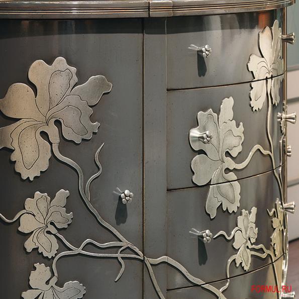 Тумба / комод с четырьмя выдвижными ящиками и двумя дверками (внутри: деревянные полки в тон фасаду). Декор в виде резных цветков ириса (доступны другие цветы по желанию заказчика). Варианты оттенков: светло-желтый / черный / морской синий. Отделка – лак, потертости – имитация состаривания.