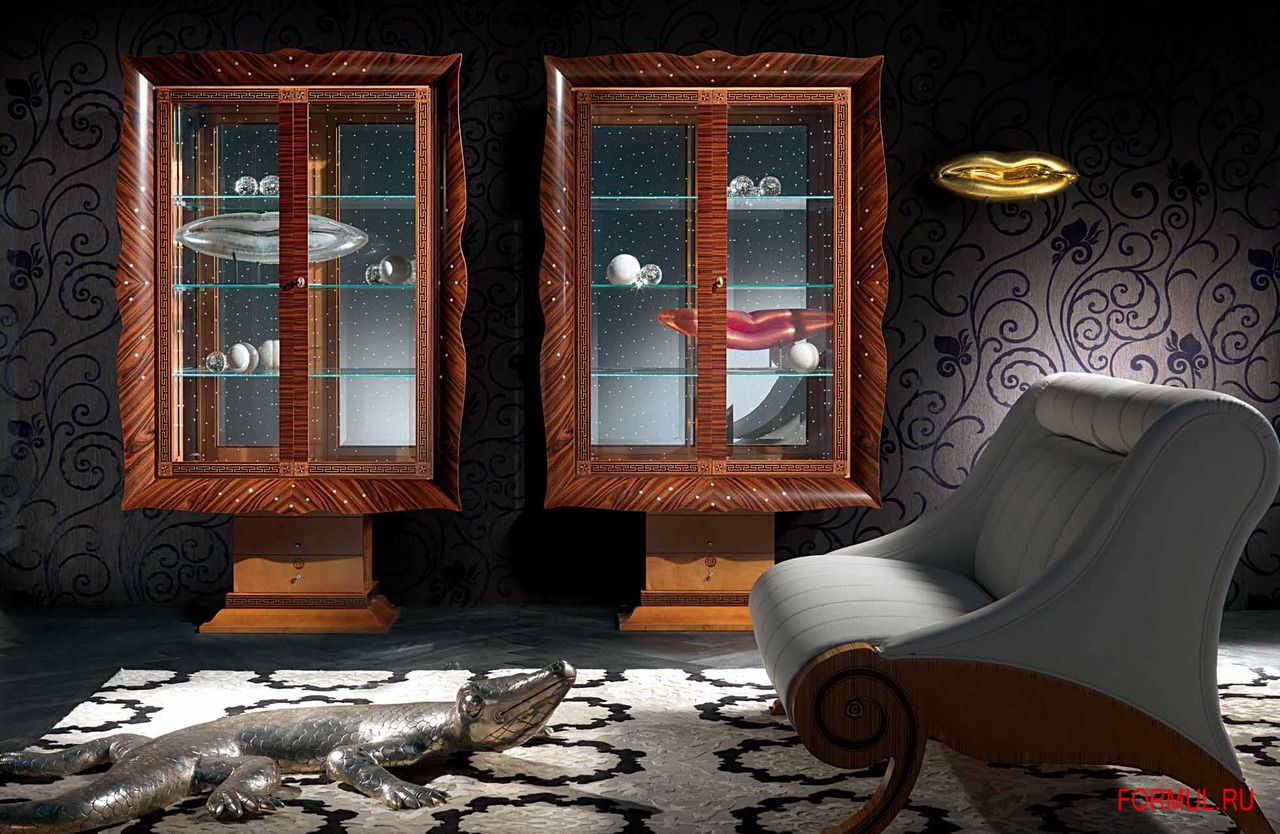 Двухстворчатый шкаф-витрина на высоком пьедестальном основании, в котором "спрятаны" два выдвижных ящика. Фасад оформлен рельефной картинной рамой, распашные дверцы запираются на ключ.