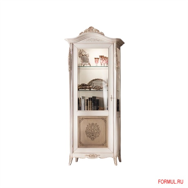 Витрина в классическом стиле. Включает одну распашную дверцц с полками для хранения. Модель выполнена из массива натуральной древесины. Доступны различные варианты отделки по каталогу фабрики. Изделие декорировано искусной резьбой ручной работы.