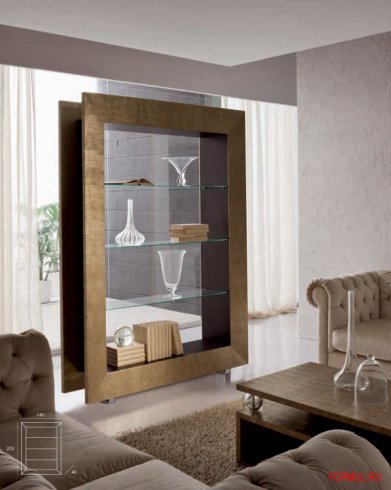 Двухсторонняя витрина, рама покрыта натуральной кожей, 3 глянцевые стеклянные полки