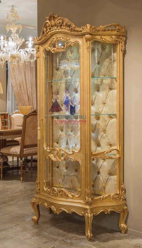 Великолепная витрина выполненная в классическом стиле. Задняя панель выполнена в стяжке капитоне.