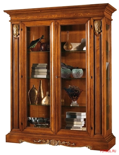 Двустворчатая витрина в классическом стиле. Изготовлена из натуальной древесины. Декор - резьба ручной работы (растительный орнамент, цветочный мотив), детали оформлены позолотой.