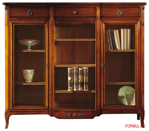 Невысокий книжный шкаф в классическом стиле. Выполнен из древесины вишни. Включает центральную открытую секцию для хранения с полками, две распашные остекленные дверцы, три выдвижных ящика в традиционном соединении"ласточкин хвост". Отделка поверхностей – лак, пчелиный воск.