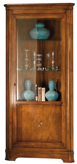 Угловая витрина из древесины ореха. За распашной дверцей со стеклянной вставкой расположены полки из прозрачного стекла. Отделка поверхностей – лак, пчелиный воск.