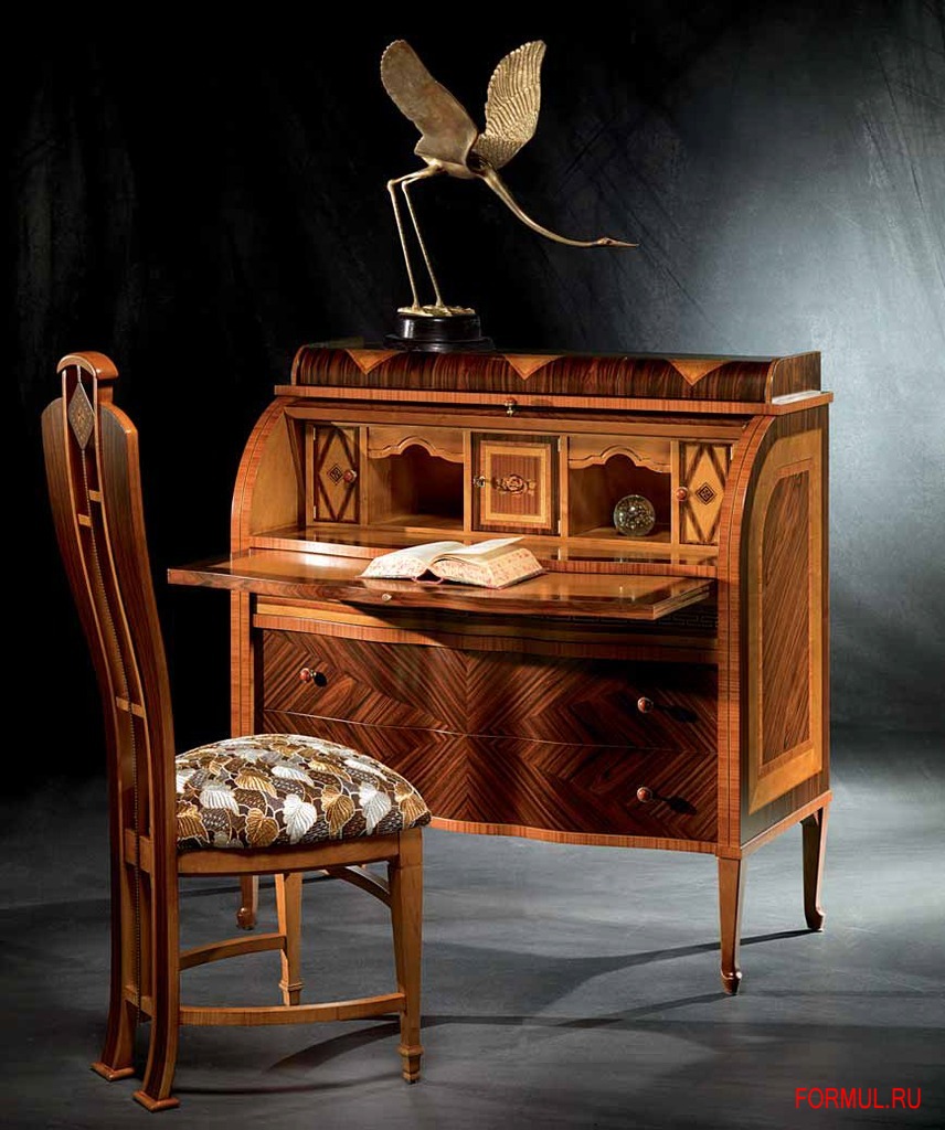 Модель с изогнутой откидной панелью, выдвижным топом (рабочая поверхность) и тремя выдвижными ящиками различной глубины. Выполнена из массива, в отделке используется шпон палисандра, розового дерева, а также капокорня (светлые оттенки) - спил с корневища или капа (нароста на дереве), дающий характерный узор из пятен и наплывов.