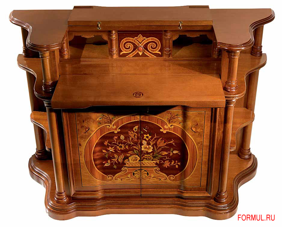 Тумба / секретер в классическом стиле. "Складной" топ и откидная передняя панель открывают секцию для хранения с выдвижными и "потайными" ящичками и отделениями-нишами для нужных мелочей. Изогнутые боковины, ограниченные декоративными колоннами, дополнены полками, повторяющими очертания основания и топа.