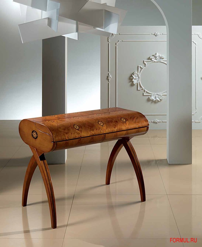 Бюро из массива древесины. Отделка — шпон ореха, эбенового дерева, шпон с наплывами (спил с корня или капа древесины) с декоративной раскладкой узора волокон.
