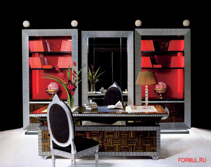 Библиотека L500.01, состоящая из трех отсеков, совмещающая темное эбеновое дерево, ярко-красную внутреннюю отделку, традиционную для китайской мебели, и серебряные резные части.