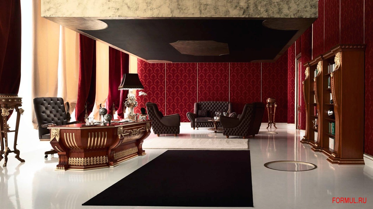 Материалы/отделка: элитные ткани/кожа, натуральное дерево, стекло, резные элементы, сусальное золото/серебро, инкрустации.