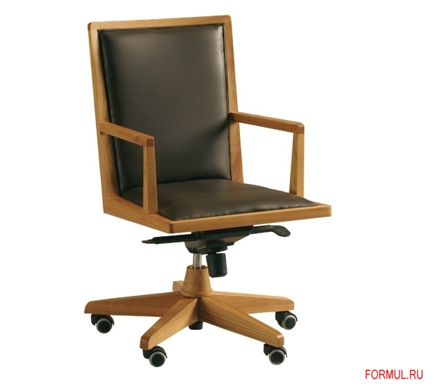 Вращающееся кресло на каркасе из вишни. Основание на колесиках. Регулировка высоты. Сиденье и спинка обиты.